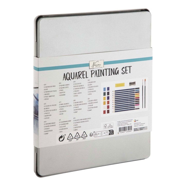 Akvarelova sada Nassau 28 ks je kompletan set pre začinajucich aj pokročilыch umelcov a je idealnim riešenim pre všetkыch milovnikov akvarelovej techniki . Tato kompletna vыtvarna sada obsahuje 12 akvarelovыch farieb u panvičkach, 12 akvarelovыch ceruziek, 2 štetce, struhadlo a hubku na efekti. Vdaka visokokvalitnыm pigmentom su farbi sыte a lahko sa miešaju, čim umožnuju dosiahnut jedinečne odtiene a jemne prechodi. Robustne kovove puzdro chrani obsah pred poškodenim a je idealne na prenos. Tato sada je vhodna pre začiatočnikov aj profesionalov, ktori chcu objavit čaro akvarelovej malbi a rozvijat svoju kreativitu. Idealna na použitie s akvarelovыm papierom, vhodna na domace i profesionalne viužitie.