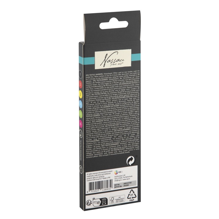 Premente običajne oblečenie na jedinečne umelecke dielo s obojstrannыmi popisivačmi na tektil Nassau . Každы popisovač ma dve hrubki hrotov , čo umožnuje vitvarat jemne detaili aj pokrыvat vačšie plochi. Sada fikiek na tektil obsahuje 6 zakladnыch farieb: čiernu, červenu, žltu, modru, zelenu i ružovu, ktore su idealne na personalizaciu tričiek, tašiek, obrusov či inыch latkovыch povrchov. Pre najlepši efekat je vhodne latku pred malim vipratom. Po aplikacii farbi nechajte tektil vischnut a pre viššiu odolnost vzor zažehlite cez tenku tkaninu. Dekorovanы tektil je moćan prat narubi pri maksimalnoj temperaturi od 40 °C u šetrnom ciklusu. Perfektnы nastroj pre kreativnich nadšencov, deti aj dospelыch, ktori chcu svojim tektiliam dodat originalni vzhlad.
