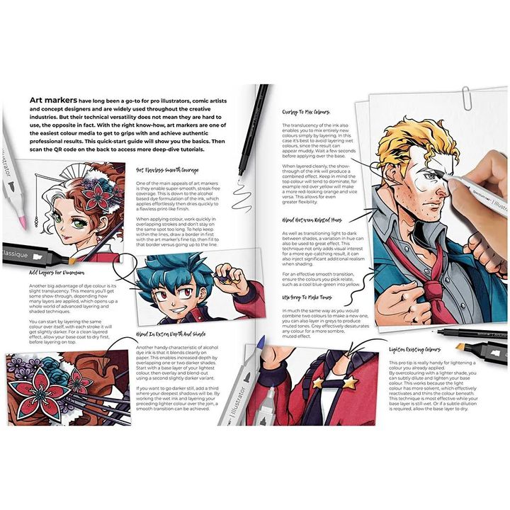 Spectrum Noir Manga i Comic Heroes set je profesionalni umetnički set dizajniran posebno za ljubitelje mange i stripova. Pakovanje sadrži 5 klasičnih dvostranih markera, 5 ilustrativnih dvostranih markera, 1 umetničku podlogu sa 0,3 perom, 6 unapred odštampanih ilustracija u crnoj boji, 6 unapred odštampanih ilustracija u sivoj boji i set uputstava. Ovaj set je savršen za one koji žele da kreiraju prelepe ilustracije u pravom manga stilu. Uz pomoć visokokvalitetnih markera i uputstava naučićete uzbudljive tehnike bojenja koje će vašem radu dodati dubinu i dimenziju. Otkrijte svog unutrašnjeg umetnika uz ovaj ekskluzivni set ilustracija. Komplet uključuje originalne radove raznih umetnika koje možete lako da obojite visokokvalitetnim markerima Spectrum Noir. Markeri su najvišeg kvaliteta i savršeni za one koji žele da boje kao profesionalci. Sa uskim vrhom na jednoj strani i četkom na drugoj, možete da bojite precizno i potpuno kontrolisano. Priloženi vodič pruža uputstva korak po korak za savršeno senčenje i uzbudljive tehnike nanošenja slojeva. Rezultat su fantastične ilustracije sa impresivnim detaljima i balansom boja.