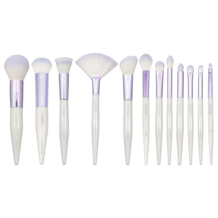Dovedite svoj izgled do savršenstva sa ovim belo - ljubičastim kompletom kozmetičkih četkica CHIQUE koje proizvodi svetski poznati američki brend Royal & Langnickel. U svakom setu ćete pronaći razne četkice za puder, senke, obrve, usne, kao i praktičan neseser za pakovanje četkica. Samo izaberite prave četkice za sebe. Sintetička vlakna profesionalnog kvaliteta su veganska i nisu testirana na životinjama. Elegantne bele ručke pružaju maksimalnu izdržljivost i vodootporne su.